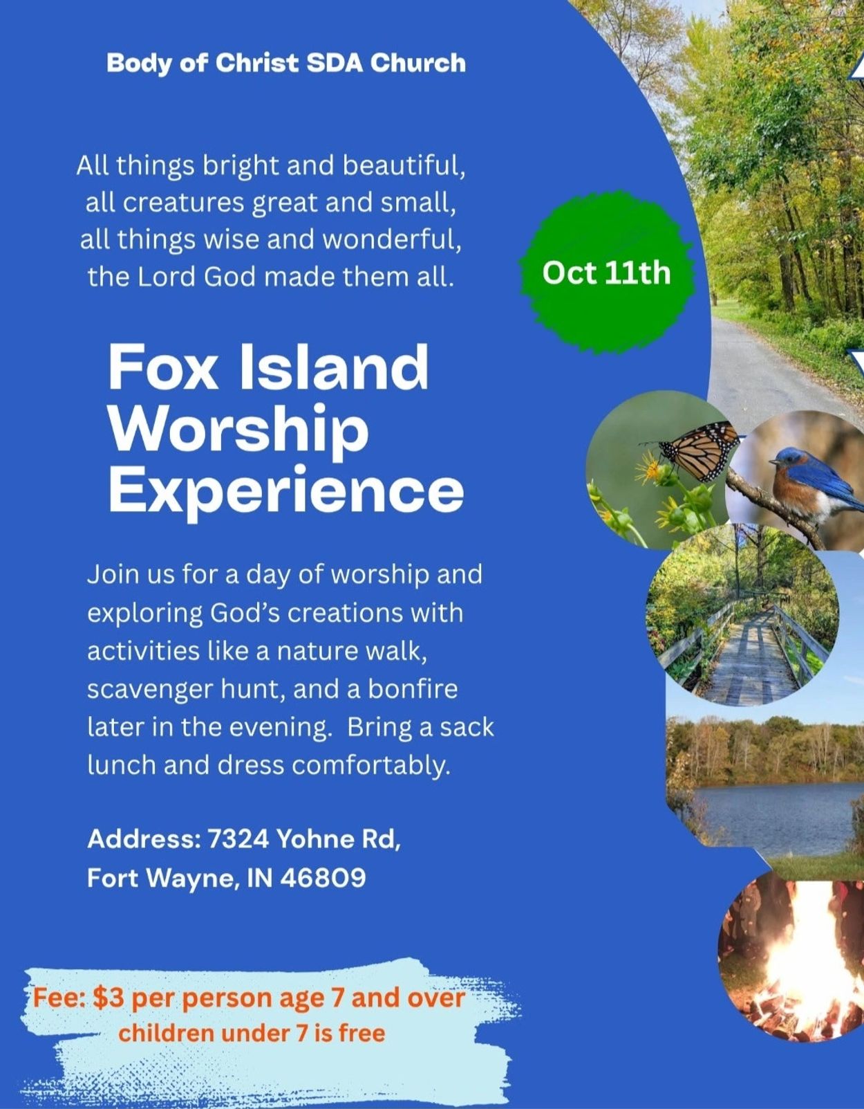 Join us this Sabbath, October 11,2025 as we get back to nature at Fox Island! We’ll see you there!